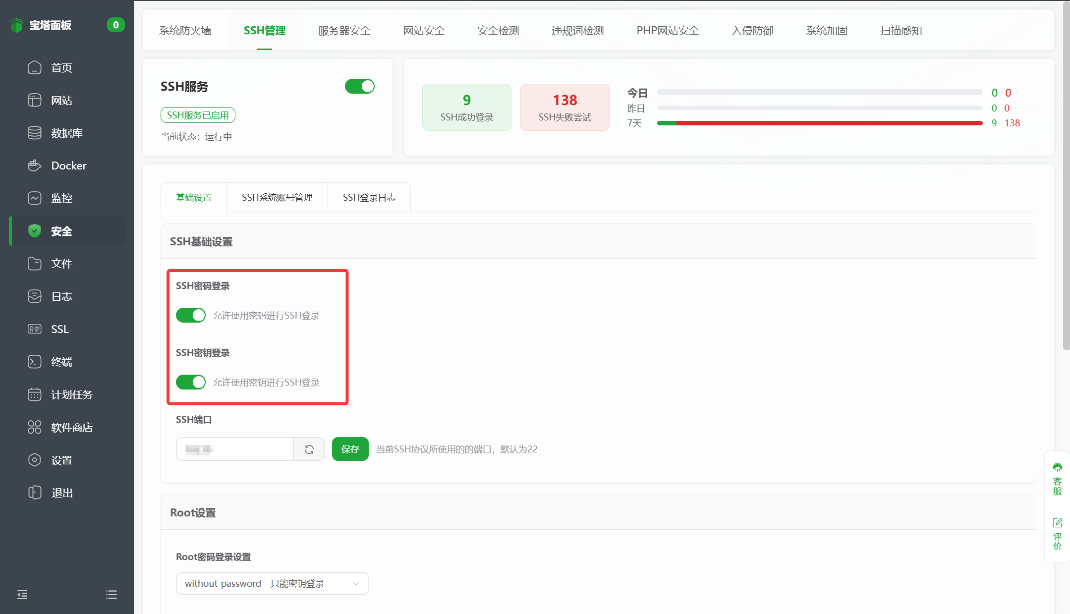 SSH端口默认为22,所以人人都知道,如果只想自己知道怎么办呢?改一下他就好了(虽然还是逃不过部分手段的制裁但是还是能起一点防护作用),在SSH端口中输入你想改的端口,或者点击旁边的按钮进行随机端口,随后单击保存就好啦!(记得去系统防火墙中看一眼端口开发了没有喔,如果云厂商有安全组,记得放行!)同时开启SSH密钥登录,随后在Root设置中将登录设置改为只能密钥登录,这样就极大的降低了密码泄露的风险