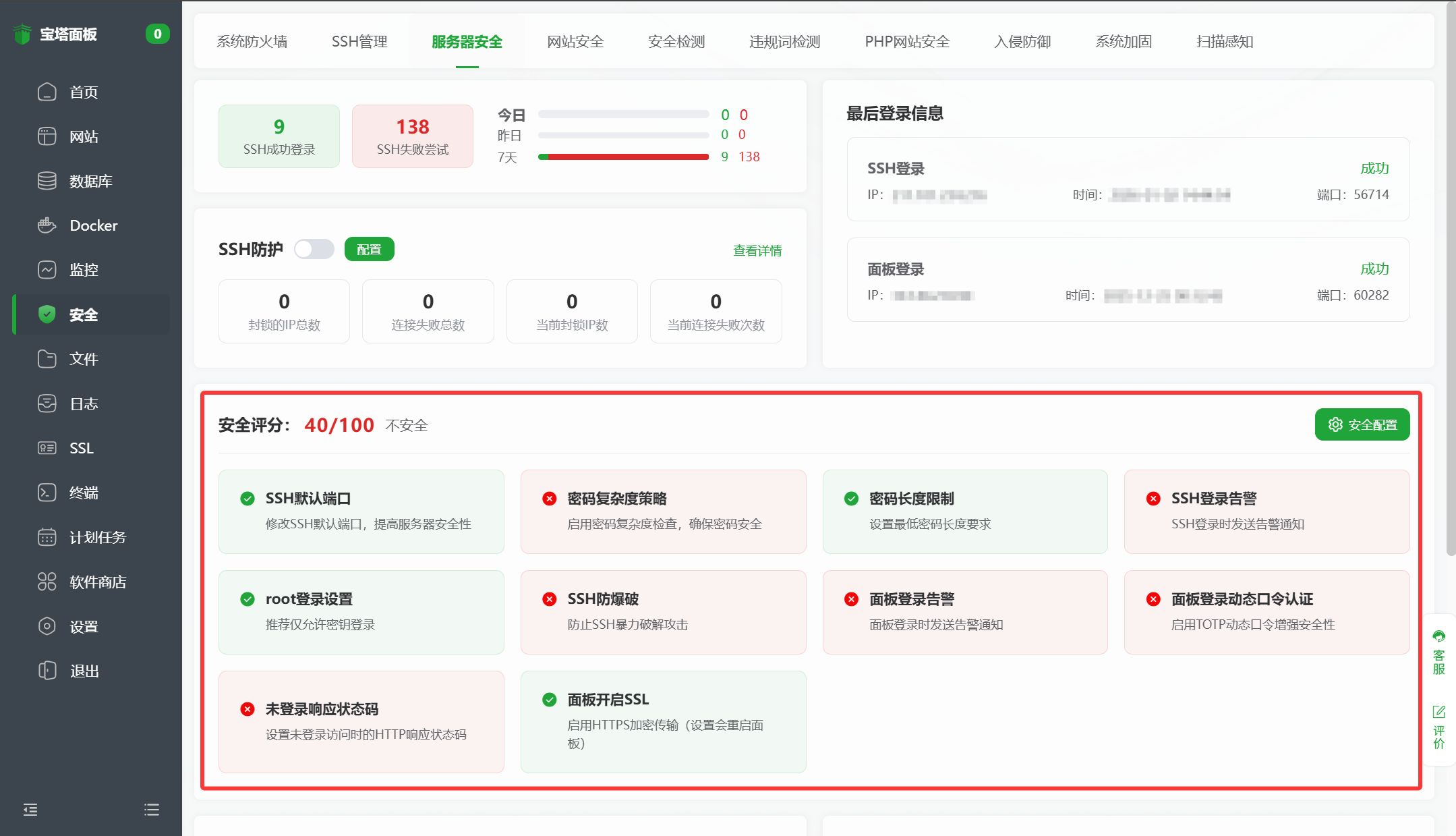 在软件商店安装fail2ban,随后在安全->SSH安全->(下滑)安全功能->SSH安全防护,打开它!